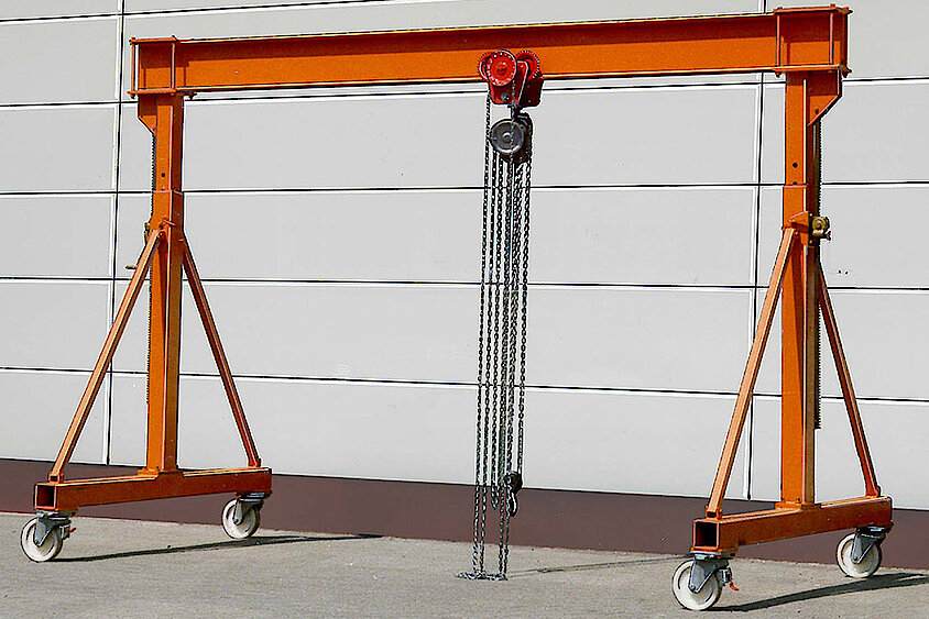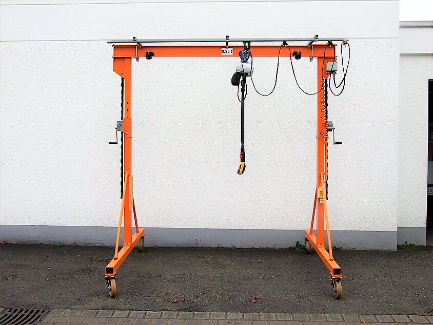 The Portable Gantry Crane KPK-ZH can be adjusted in height via two rack jack winches in an unloaded condition. Extent of supply for cranes: crane, crane test book with preliminary and construction test, operating instructions. Hoist is not included.