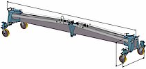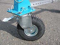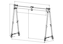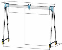 Sur le modèle de base, deux vis permettent de régler en continu, de chaque côté, la distance entre les montants. La hauteur du portique est réglable par intervalles. Les roues avec revêtement vulkollan, d’un diamètre de 200 mm, sont équipées d’un blocage de direction et d’un frein. Des roues tout-terrain avec pneus peuvent sont disponibles sur demande.